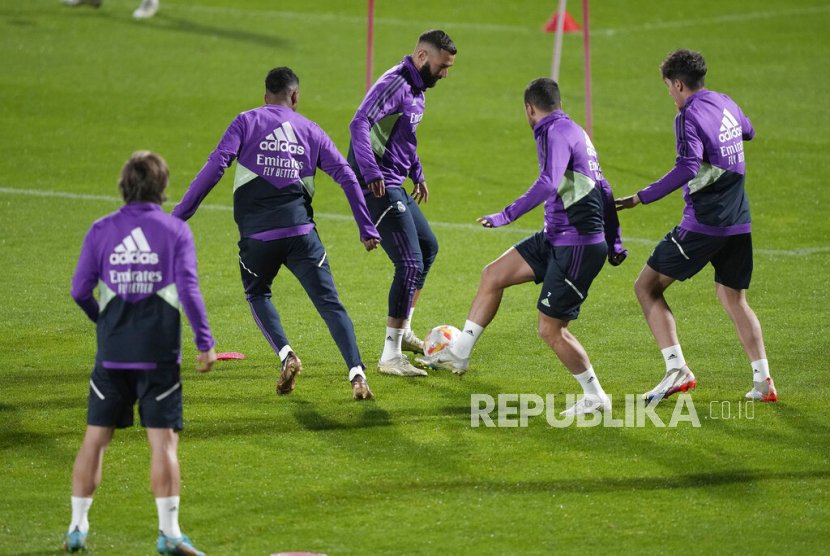 LM – JAKARTA — Striker andalan Real Madrid, Karim Benzema, melakukan latihan di Stadion Mrsool Park, markas Al Nassr, di Riyadh, Arab Saudi, Selasa (10/1/2023). Benzema bersama skuad Real Madrid akan melakoni laga babak semifinal Piala Super Spanyol pada Rabu (11/1/2023) malam waktu setempat.