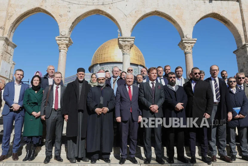 Diplomat negara Eropa bertemu dengan ulama dan tokoh foto bersama di depan Masjid Al-Aqsa Palestina pada Rabu (18/1/2022).