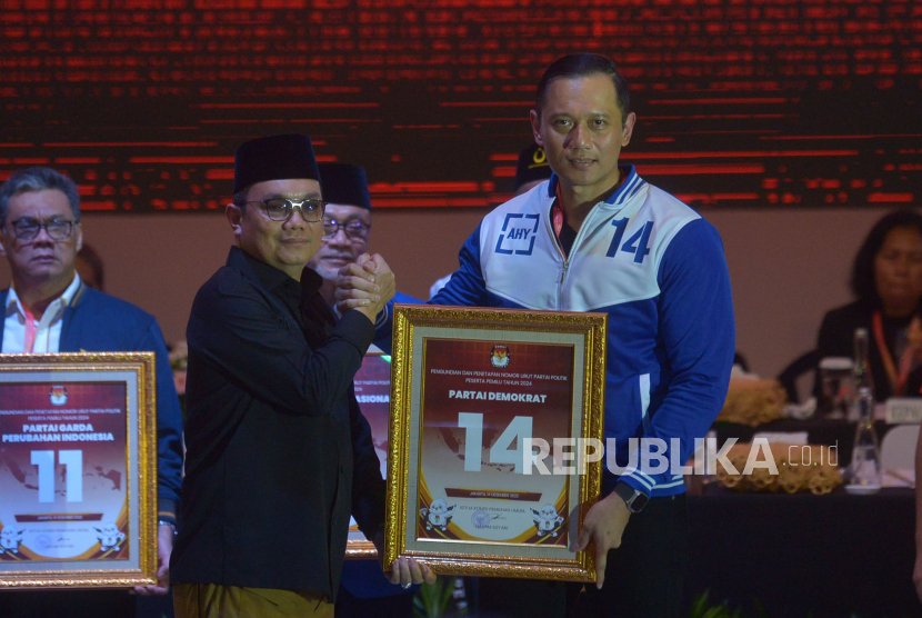 Ketua Umum Partai Demokrat Agus Harimurti Yudhoyono menerima Nomor Urut pada acara Pengundian dan Penetapan Nomor Urut Partai Politik Peserta Pemilihan Umum Tahun 2024 di Kantor KPU, Jakarta, Rabu (14/12/2022). KPU resmi mengumumkan dan menetapkan nomor urut untuk 17 partai politik Nasional dan 6 Partai lokal aceh. Republika/Prayogi