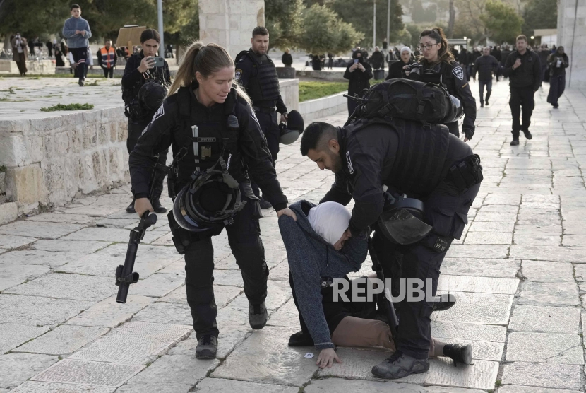 Polisi Israel menangkap seorang wanita Palestina di kompleks Masjid Al-Aqsa setelah penggerebekan di situs di Kota Tua Yerusalem pada bulan suci Ramadhan, Rabu (5/4/2023).