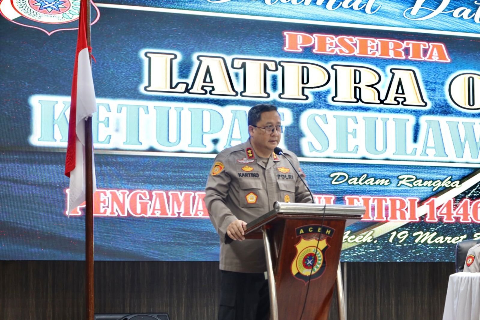 LM — Kapolda Aceh Irjen Dr. Achmad Kartiko, didampingi Wakapolda Brigjen Misbahul Munauwar membuka pelatihan pra operasi (Latpraops) Ketupat Seulawah-2025 di Aula Presisi Polda Aceh, pada Selasa, 18 Maret 2025.