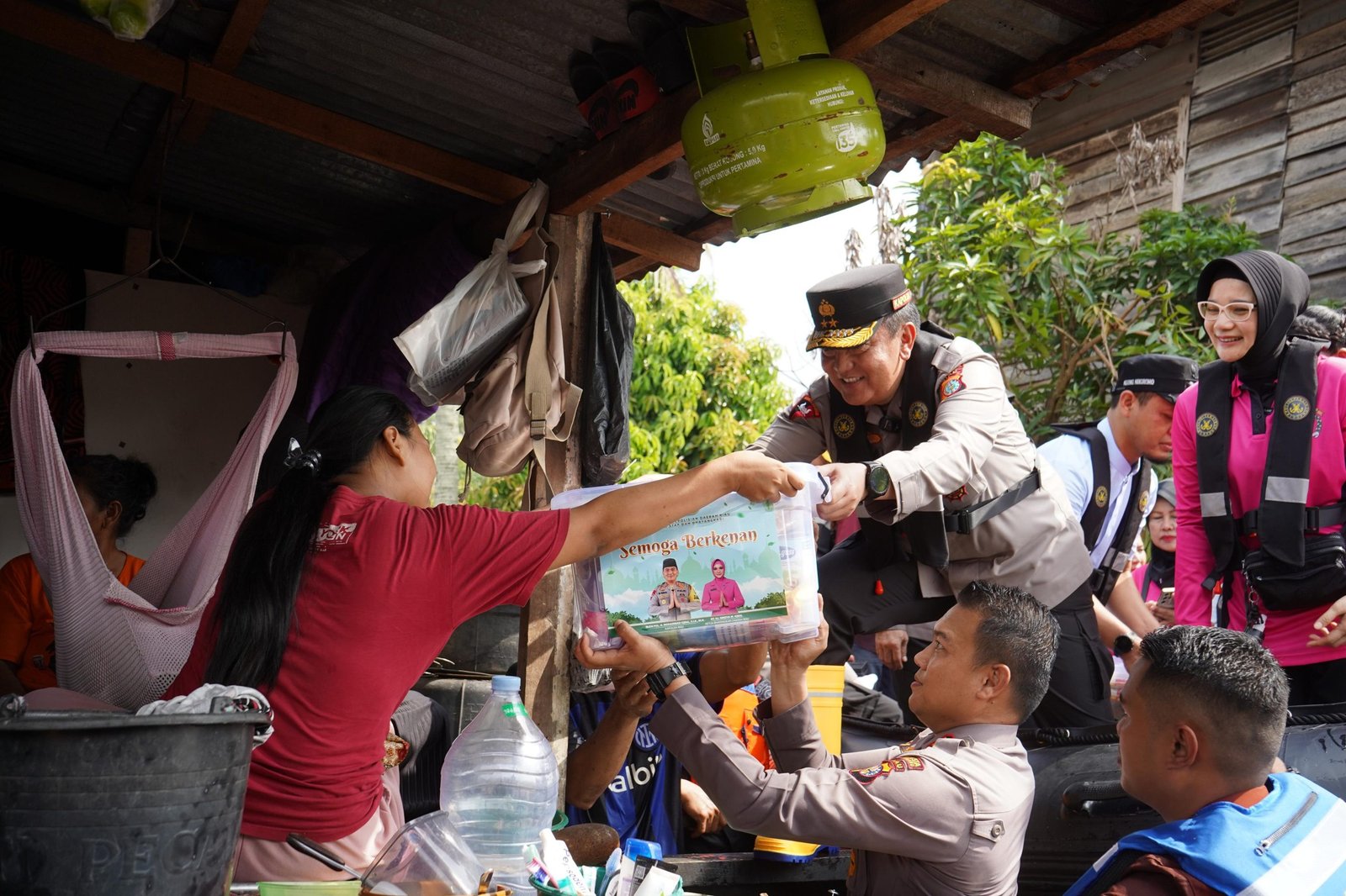 LM – Kapolda Riau Irjen Mohammad Iqbal, didampingi Ketua Bhayangkari Daerah Riau Ny Nindya Iqbal tinjau langsung warga korban banjir di Jalan Yos Sudarso Rumbai kota Pekanbaru, Jumat, 7 Maret 2025.