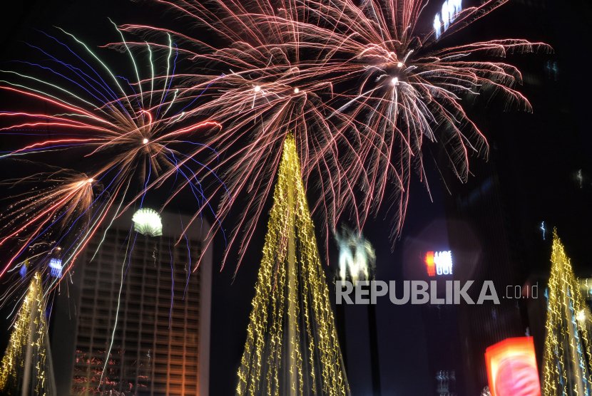 Suasana pesta kembang api di kawasan Bundaran Hotel Indonesia, Jakarta, Ahad (1/1/2023) dini hari. Pada malam pergantian Tahun Baru 2023, ribuan warga memadati kawasan tersebut untuk menyaksikan pesta kembang api dan festival musik di sepanjang jalan Sudirman Thamrin. Republika/Thoudy Badai