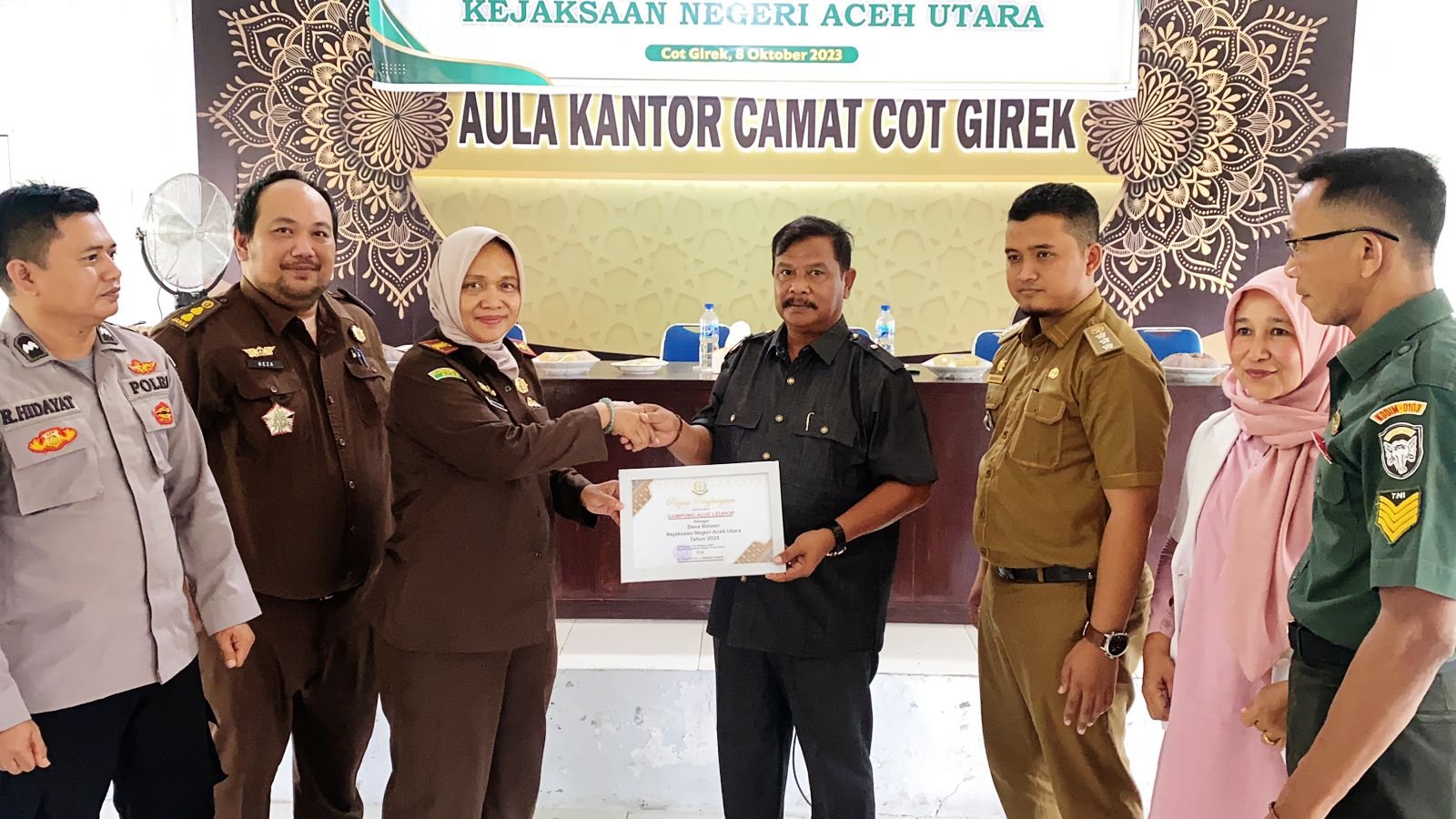 Sekaligus, Kepala Kejari Aceh Utara Dr. Diah Ayu Hartati Listiyarini Iswara Akbar didampingi Kasi Intelijen Reza Rahim, S.H, M.H memberikan piagam kepada Geuchik Alue Leuhob, Sandi.