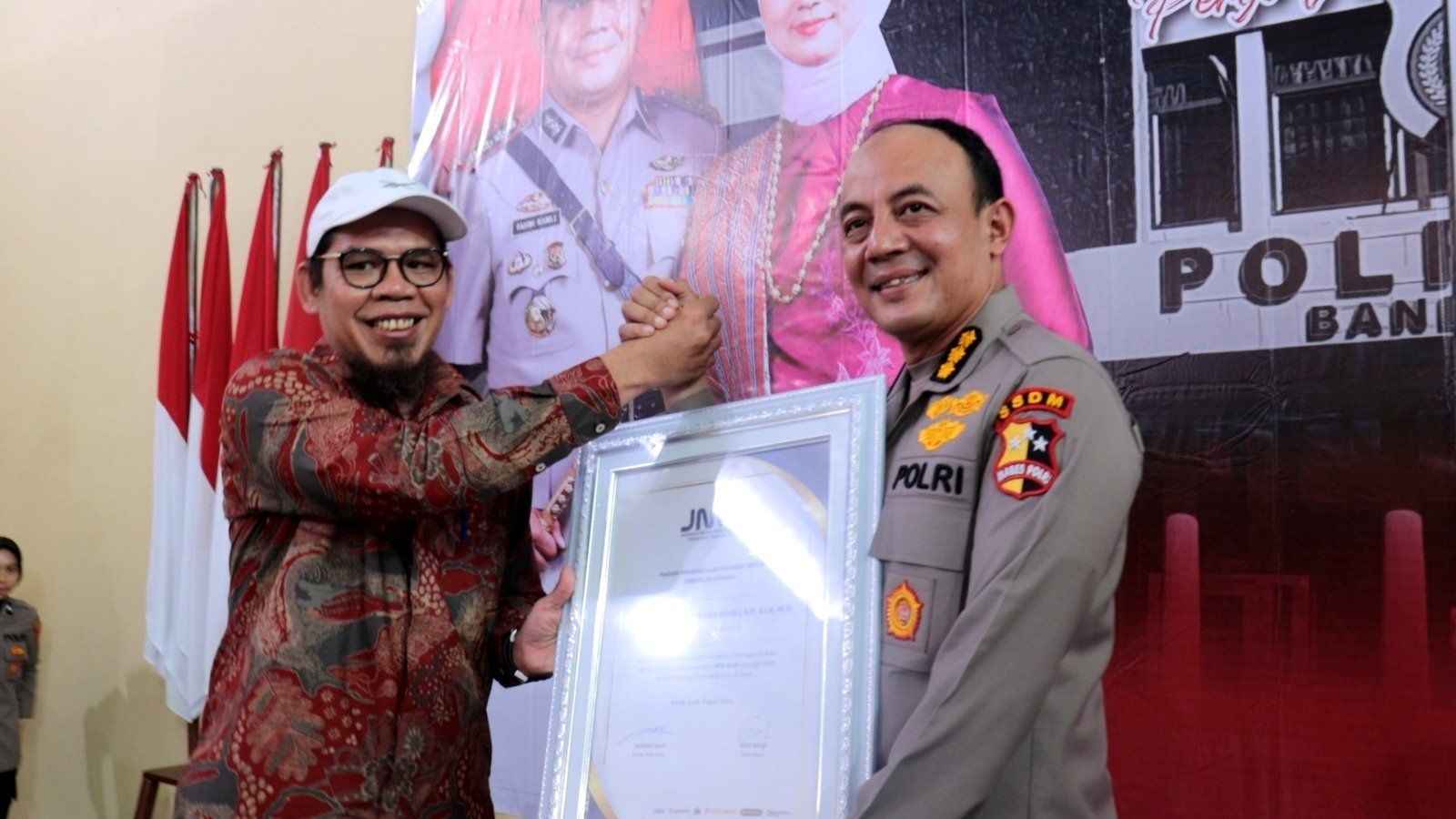 LM – Jaringan Media Siber Indonesia (JMSI) Provinsi Aceh memberikan penghargaan kepada Kombes Pol Fahmi Irwan Ramli disela kegiatan lepas sambut jabatan Kapolresta Banda Aceh di Meuligo Rastra Sewakottama, Kamis, 10 April 2025.