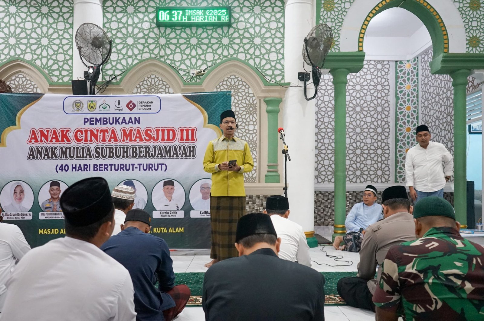 LM-Ketua Komisi IV Dewan Perwakilan Rakyat Kota (DPRK) Banda Aceh, Farid Nyak Umar menghadiri pembukaan kegiatan “Anak Cinta Masjid III Anak Mulia Subuh Berjama’ah” di Masjid Al Mukarramah, Gampong Mulia, Kecamatan Kuta Alam, Selasa (18/2/2025).