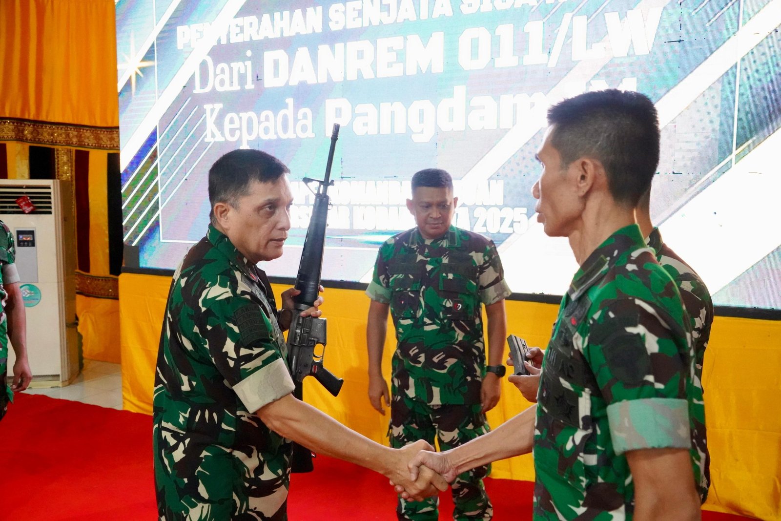 LM – Panglima Komando Daerah Militer Iskandar Muda (Pangdam IM), Mayor Jenderal TNI Niko Fahrizal, M.Tr.(Han), menerima secara simbolis satu pucuk senjata api jenis M-16 A1 beserta satu buah magazen dari Komandan Kodim 0102/Pidie, Letkol Inf Andi Irsan, M.Han., pada saat penutupan kegiatan Apel Komandan Satuan di wilayah Kodam IM.