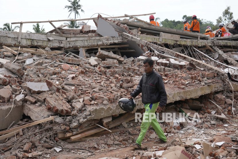 AP Photo/Tatan Syuflana Enjot, 45, yang kehilangan rumah dan beberapa kerabatnya, berjalan melewati puing-puing bangunan yang runtuh akibat gempa Senin di Cianjur, Jawa Barat, Indonesia Selasa, 22 November 2022. Tim penyelamat pada Selasa berjuang untuk menemukan lebih banyak mayat dari puing-puing rumah dan bangunan roboh akibat gempa bumi yang menewaskan sejumlah orang dan melukai ratusan orang di pulau utama Indonesia di Jawa