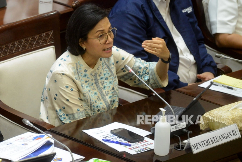 Menteri Keuangan Sri Mulyani Indrawati berbicara saat Rapat Kerja dengan Komisi XI DPR RI di kompleks Parlemen, Senayan, Jakarta, Senin (27/3/2023). Komisi XI DPR bersama jajaran Kementerian Keuangan menggelar rapat bersama terkait evaluasi reformasi birokrasi di lingkungan Kemenkeu.
