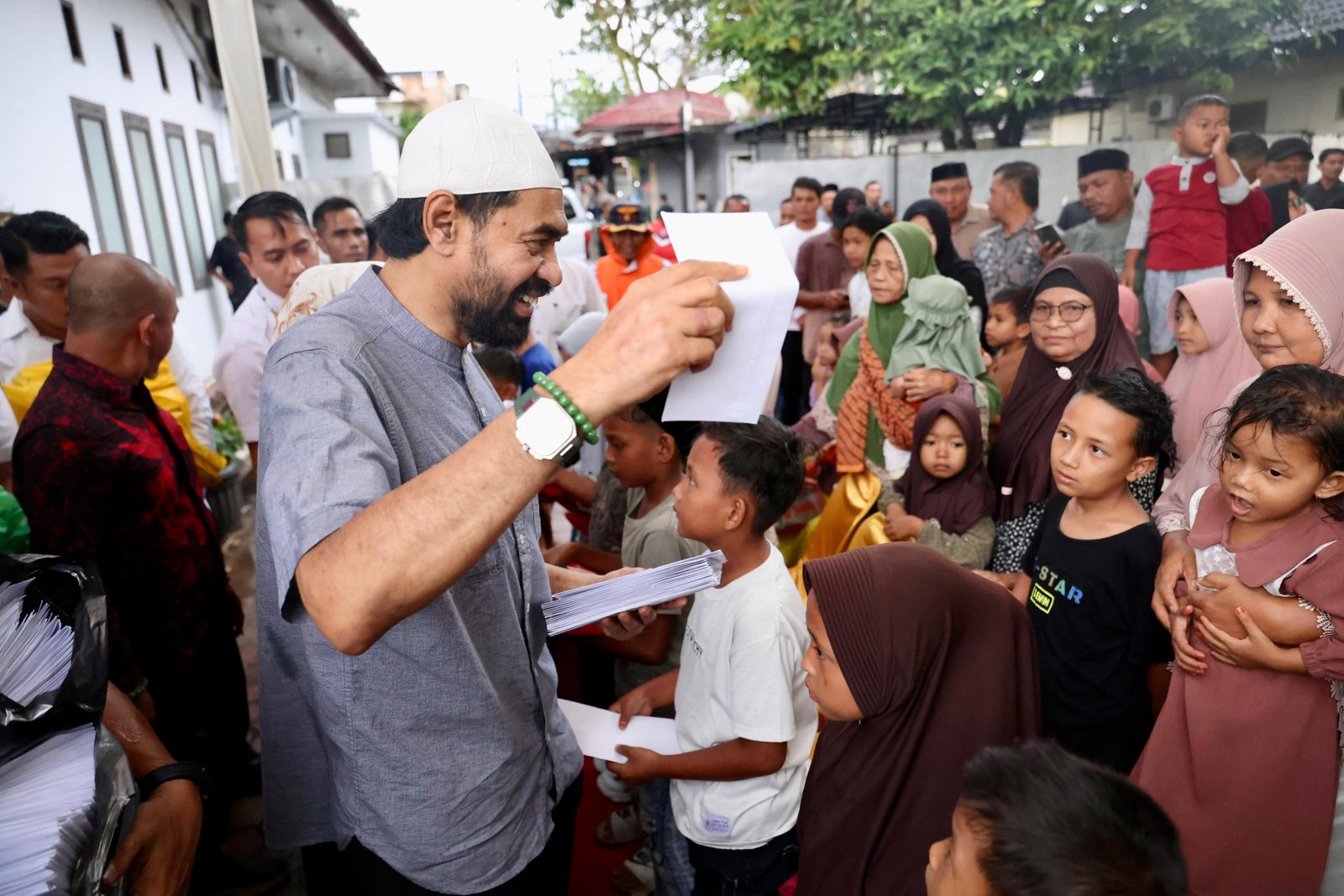 Di hadapan para tamu dan pejabat yang hadir, Mualem secara langsung menyerahkan santunan berupa uang tunai dan bingkisan kepada anak-anak yatim. Penyerahan dilakukan secara personal, satu per satu, sambil menyapa dan memberikan semangat kepada mereka.