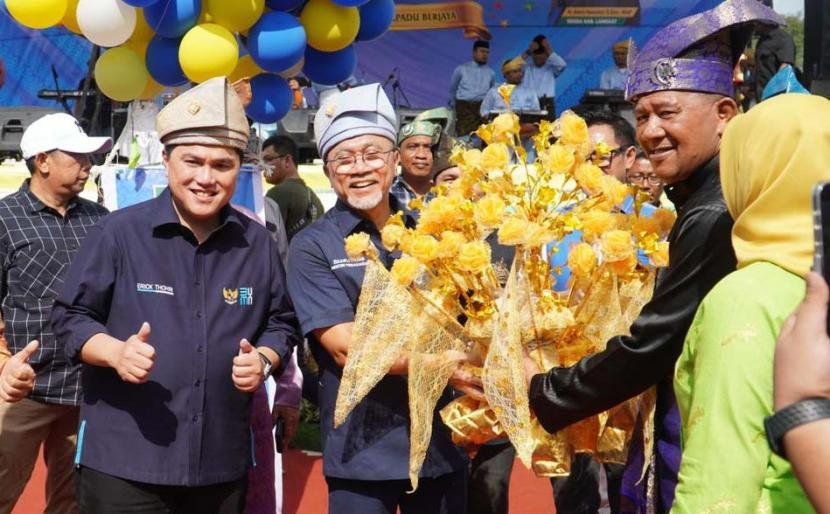 Menteri BUMN Erick Thohir, Menteri Perdagangan Zulkifli Hasan dan Bupati Langkat Syah Affandin (dari kiri) menerima bunga saat menghadiri HUT ke-273 Kabupaten Langkat, Sumatra Utara, Selasa (17/1/2023). Tak hanya mengajak Erick Thohir, Zulhas juga mengajak beberapa artis andalan PAN antara lain Pasha Ungu, Uya Kuya, serta Eko Patrio yang juga anggota DPR RI Fraksi PAN.