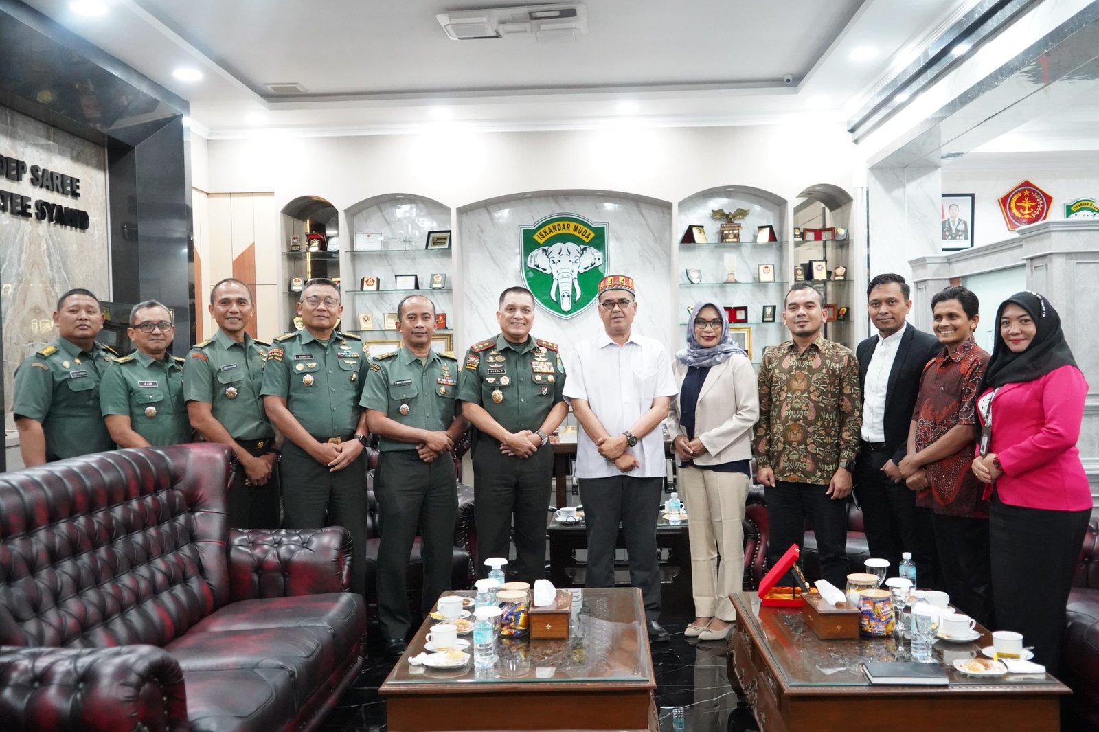 LM — Panglima Komando Daerah Militer Iskandar Muda (Pangdam IM), Mayor Jenderal TNI Niko Fahrizal, M.Tr.(Han), menerima audiensi dari Ketua Komisi Kebenaran dan Rekonsiliasi (KKR) Aceh, Masthur Yahya, S.H., M.Hum., beserta rombongan di ruang kerja Pangdam IM, Makodam Iskandar Muda, Banda Aceh, Rabu (16/7/2025).