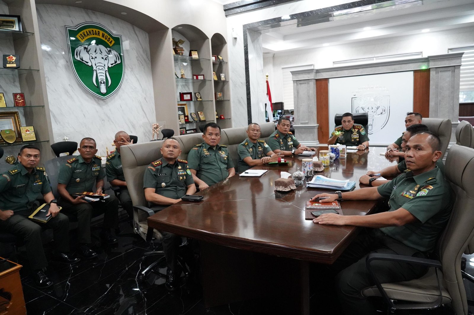 LM – Panglima Komando Daerah Militer Iskandar Muda (Pangdam IM), Mayor Jenderal TNI Niko Fahrizal, M.Tr.(Han), menerima paparan dari Komandan Korem 012/Teuku Umar, Kolonel Inf Benny Rahadian, S.E., M.Han., mengenai hasil renovasi dan pembangunan fasilitas di Makam Pahlawan Nasional Teuku Umar Djohan Pahlawan. Kegiatan ini berlangsung di ruang kerja Pangdam IM pada Kamis (20/2/2025).