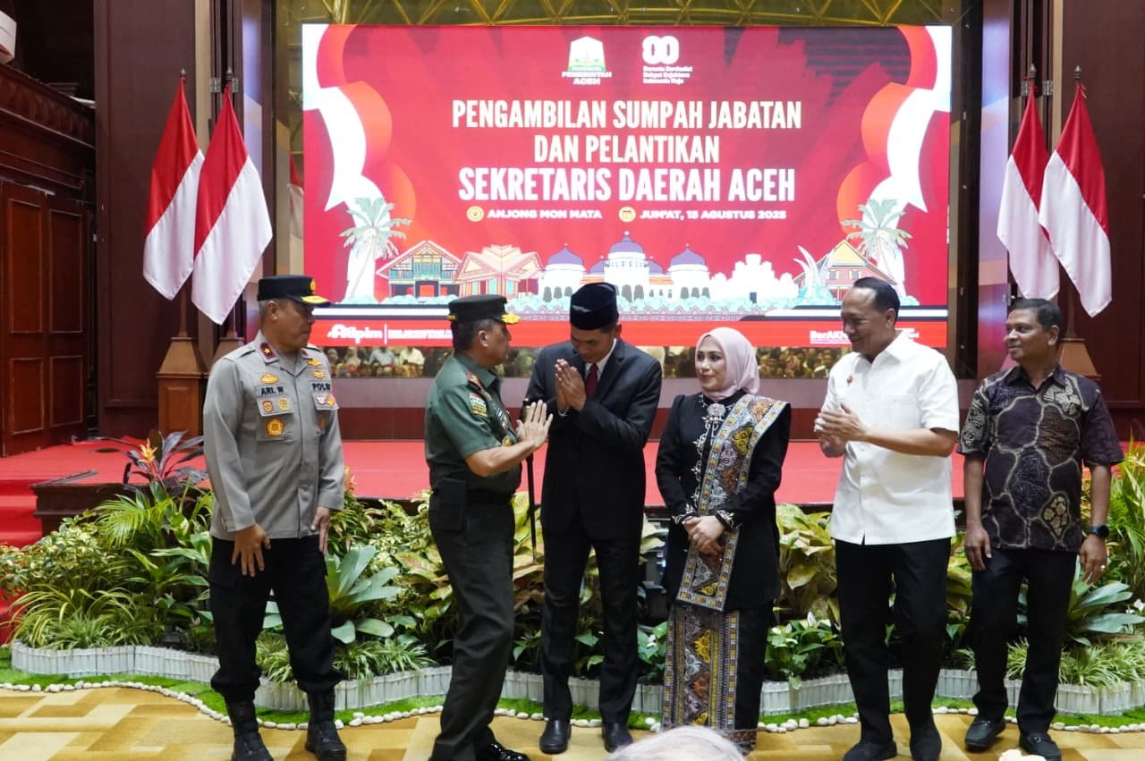 LM – M. Nasir, S.I.P., M.P.A., resmi menjabat sebagai Sekretaris Daerah (Sekda) Aceh setelah dilantik oleh Gubernur Aceh Muzakir Manaf di Gedung Anjong Mon Mata, Kompleks Pendopo Gubernur Aceh, Kota Banda Aceh, Jumat (15/8/2025) sore. Pelantikan ini turut dihadiri Panglima Komando Daerah Militer Iskandar Muda (Pangdam IM) Mayor Jenderal TNI Niko Fahrizal, M.Tr.(Han).