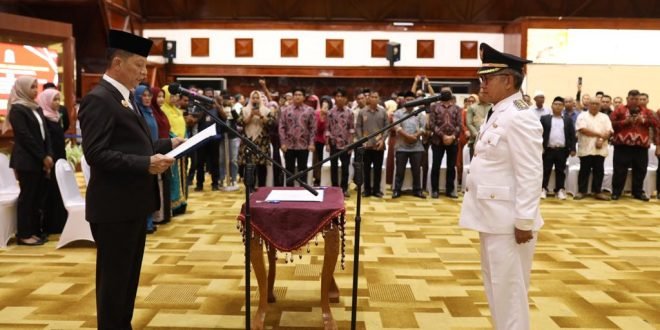 LM – Penjabat Gubernur Aceh, Achmad Marzuki, melantik Drs. Azmi, MAP, sebagai Penjabat (Pj) Bupati Aceh Singkil untuk masa jabatan 2023-2024. Prosesi pelantikan berlangsung di Anjong Mon Mata, Komplek Meuligoe Gubernur Aceh, Jumat, 21 Juli 2023.
