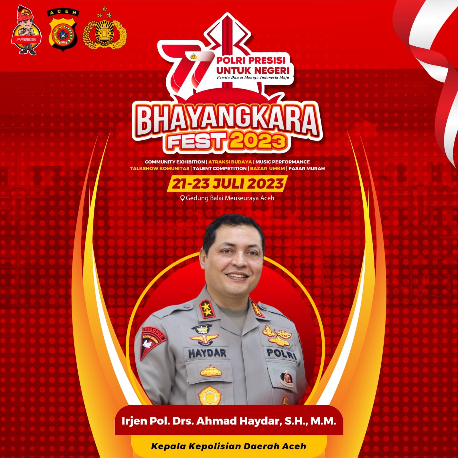 LM – Polda Aceh siap menggebrak dengan Bhayangkara Fest 2023 yang bakal digelar di Balee Meuseuraya Aceh (BMA), Kota Banda Aceh pada 21 hingga 23 Juli 2023.