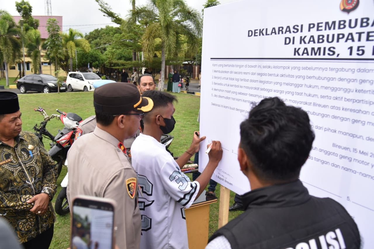 Deklarasi tersebut dipimpin Kapolres Bireuen AKBP Tuschad Cipta Herdani, dalam hal ini diwakili Wakapolres Bireuen Kompol Fauzi. Deklarasi ini juga turut dihadiri oleh Asisten I Setdakab Bireuen Mulyadi, serta pejabat dari Dinas Pendidikan, Kacabdin, kepala sekolah, dan para orang tua anggota geng motor.