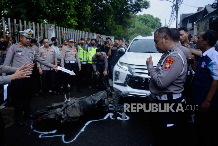 Polisi melakukan rekonstruksi ulang kecelakaan di Jalan Srengseng Sawah, Jagakarsa, Jakarta, Kamis (2/2/2022). Polda Metro Jaya menggelar rekonstruksi ulang kecelakaan yang menewaskan Mahasiswa Universitas Indonesia M. Hasya Attalah Syahputra dan melibatkan terduga penabrakan purnawirawan Polri AKBP Eko Setio Budi Wahono. Rekonstruksi tersebut menghadirkan sembilan saksi dan sembilan adegan.