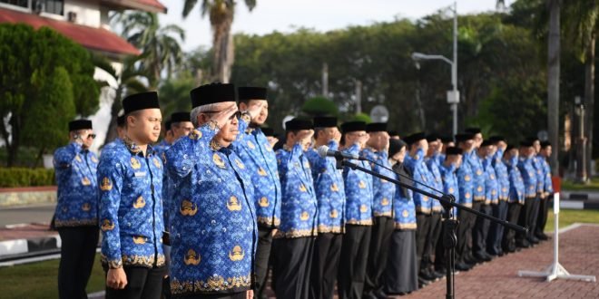 Sekda Aceh Bustami, SE, M.Si, saat menjadi Inspektur Upacara Gabungan yang diikuti oleh para Kepala SKPA/Biro beserta para Pejabat Eselon III, Eselon IV dan pejabat Fungsional di Halaman Kantor Gubernur Aceh, Banda Aceh, Selasa (17/1/2023).