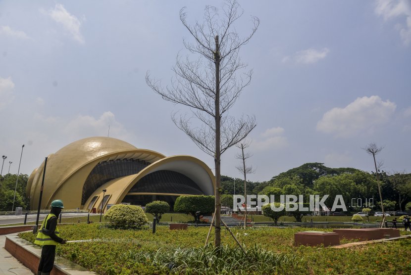 Republika/Putra M. Akbar Pekerja menyiram tanaman dengan latar belakang Teater Keong Emas di Taman Mini Indonesia Indah (TMII). TMII segera menyiapkan lahan untuk anjungan tiga provinsi baru.