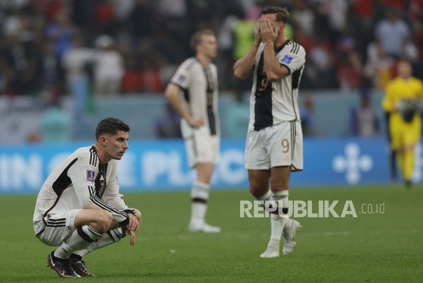 Kai Havertz (Kiri) dan Niclas Fuellkrug (Kanan) dari Jerman bereaksi setelah pertandingan sepak bola grup E Piala Dunia 2022 antara Kosta Rika dan Jerman di Stadion Al Bayt di Al Khor, Qatar, Jumat (2/12) dini hari WIB.